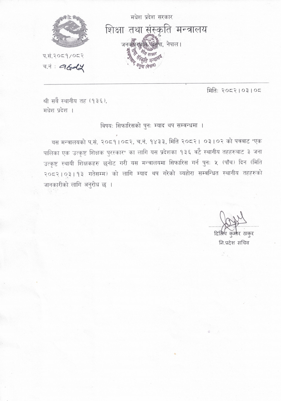 सिफारिसको पुन: म्याद थप सम्बन्धमा ।