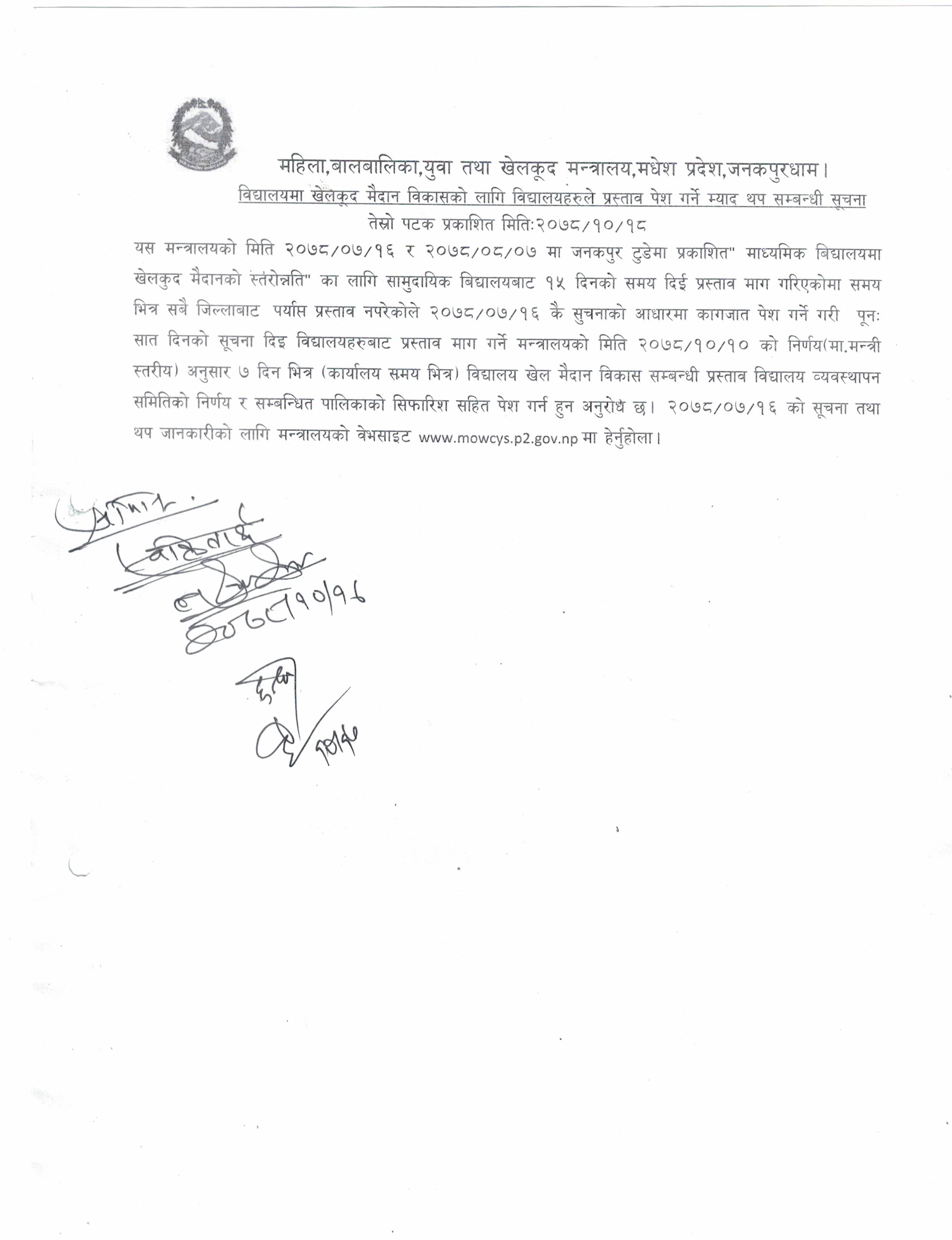 विद्यालयमा खेलकूद मैदान विकासको लागि विद्यालयहरुले प्रस्ताव पेश गर्ने म्याद थप सम्बन्धी सूचना।